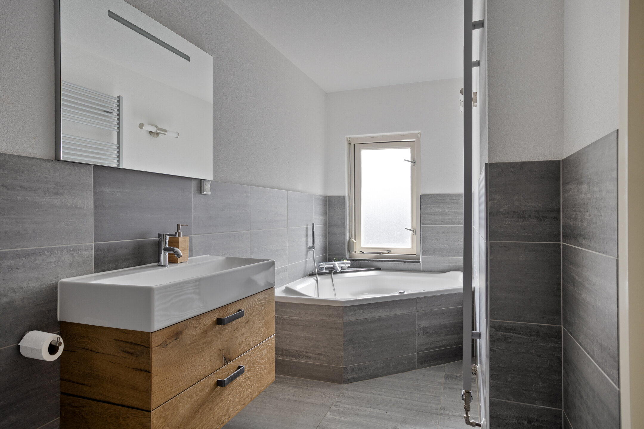 - Vergrote badkamer met hoek-/ligbad, inloopdouche, zwevend toilet en wastafelmeubel.