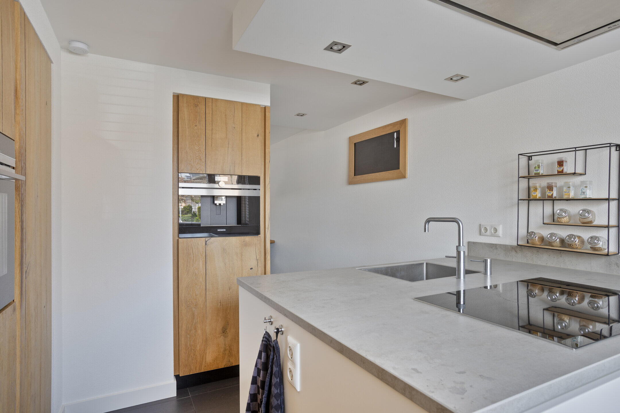 Begane grond: entree, hal met uitgebreide meterkast, een vaste kast en een vernieuwd toilet met fontein. Uitgebouwde woonkamer met openslaande deuren naar terras en tuin. Open keuken met kookeiland, ontworpen door een interieurbouwer, voorzien van Siemens apparatuur, te weten grote koelkast en vriezer, 5-pits inductiekookplaat, afzuigkap, combi magnetron, stoomoven, vaatwasser, koffieapparaat, warmhoudlade en quooker. Praktische provisiekast.